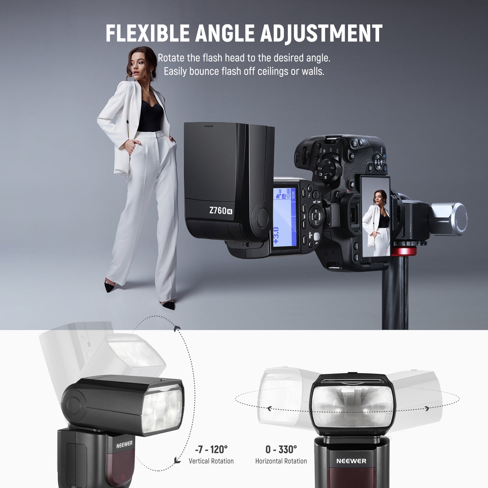 - Flexible Angles & Soft Light Effects- The flash can be adjusted from 0° to 330° horizontally and -7° to 120° vertically, allowing for precise control of light direction. Even bounce flash off ceilings or walls with the included diffuser and catchlight panel for soft light and radiant catchlights. The flash coverage can be automatically or manually set to match 20-200mm lens focal lengths. A 2.5mm sync jack also included