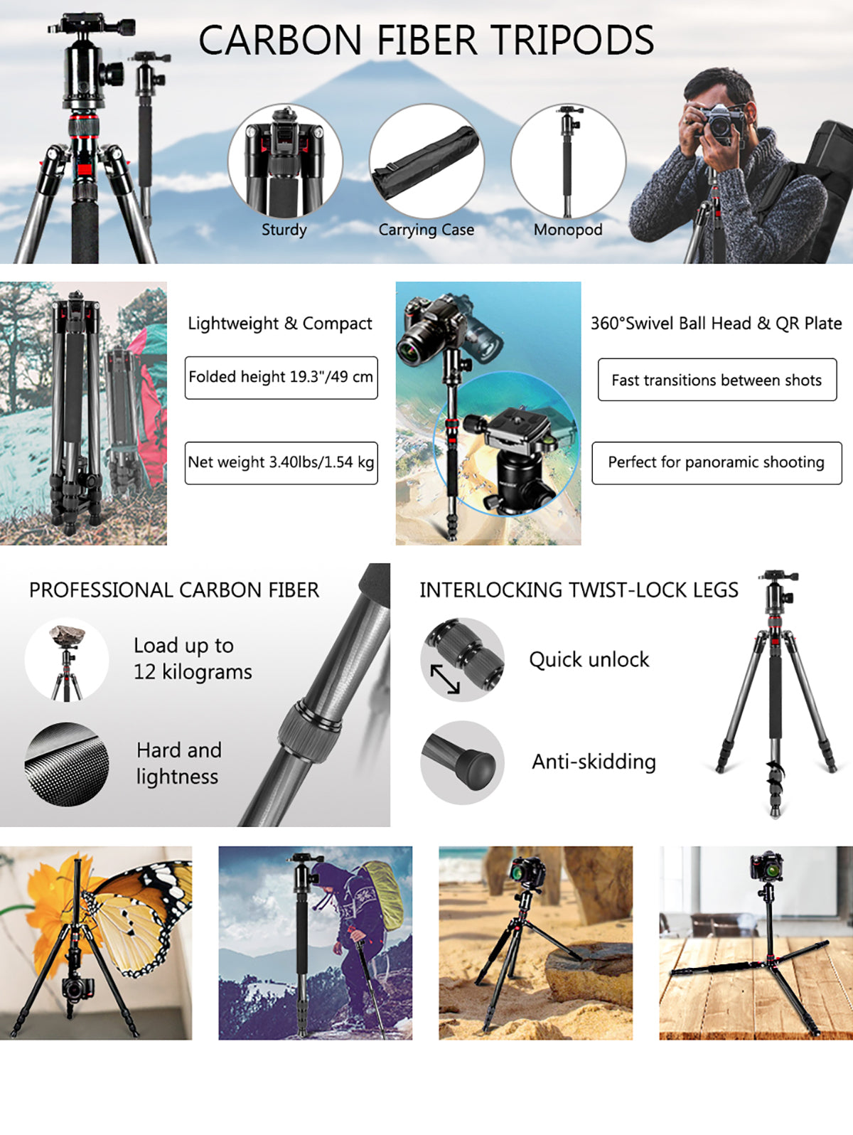 - Solid Carbon Fiber Build- Carbon fiber tripod with 8-layered laminate is strong, lightweight, and corrosion-resistant, capable of holding 26.5lb (12kg) and withstanding challenging environments. The black exterior with stripe patterns is simplistic and sleek